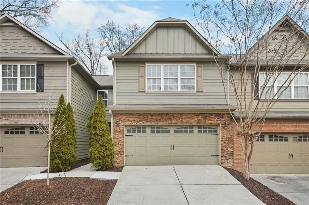 Welcome home to this beautiful townhome in a superb location in Smyrna. Enter through the main entry to the main level and be greeted by newer and beautiful hard wood flooring. The main floor features a good size living room with a decorative fireplace. The kitchen is open concept and has stainless steel appliances and a large pantry. The kitchen opens to the dinning area which connects to the patio through a sliding glass door. The backyard is tiled and backs up to the woods, offering privacy and convenience for family gathering and grilling. A powder room and coat closet completes the main floor. Walk upstairs to a landing space that can be used as a home office. The second floor has 2 bedrooms with en-suite bathrooms and walk in closets perfect for room mates. Laundry room is conveniently located on the second floor. The community has an inviting pool, dog depot stations, walking trails, top rated schools, easy access to highways, shopping, fine dinning, the Battery park and more, all make this an unbeatable Neighborhood.